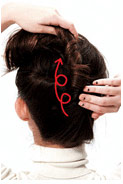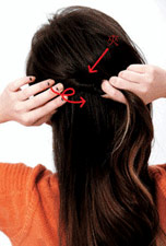 | 3.先将右側發束拉到(dào)左側,扭轉後用(yòng)小(xiǎo)黑(hēi)夾固定 |