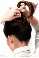 | 4.再将左側發束往右拉,和(hé)右側發束交叉繞後夾緊 |