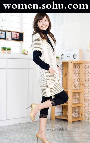 镂空式白色針織外套搭在黑(hēi)色長衫之外,抵擋秋日寒意,層疊搭配再穿上(shàng)一雙金(jīn)色的(de)高(gāo)跟鞋,富有(yǒu)時尚感。