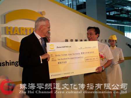 Mr.Dietmar Harting,Mrs. Margrit Harting向暨南大(dà)學珠海(hǎi)分(fēn)院代表捐贈支票幫助學校(xiào)貧困學生